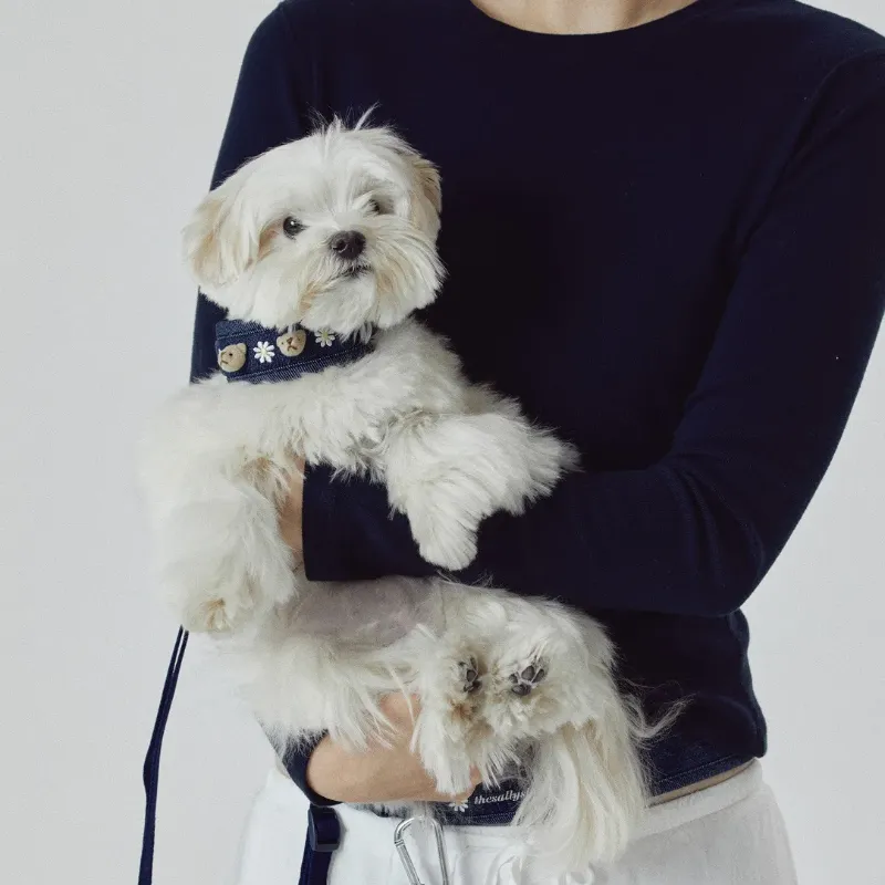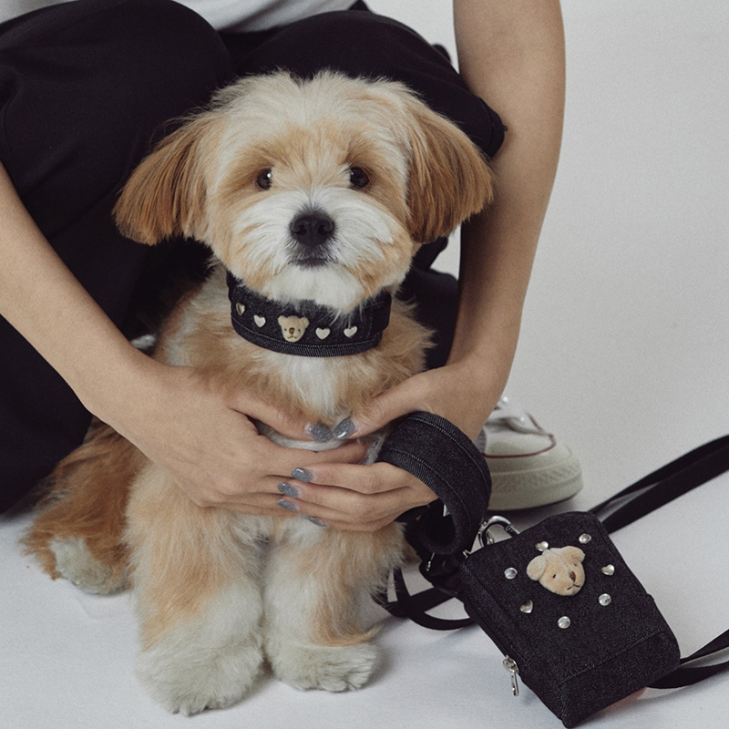 Cute Bear Embroidered Denim Dog Harness Set